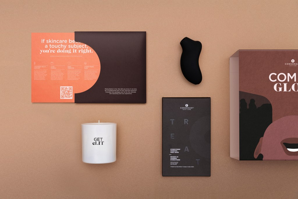 A self love starter kit with everything you need for a successful masturdate: a vibrating toy, a special co-braded “Get cLit” scented candle by Lohn, and a set of four of Consonant’s most popular sheet masks.